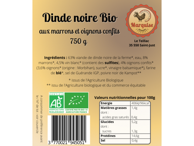 Fait maison avec les dindes de la ferme, élevées 6 mois et finies au lait de ferme bio de Saint Just.
